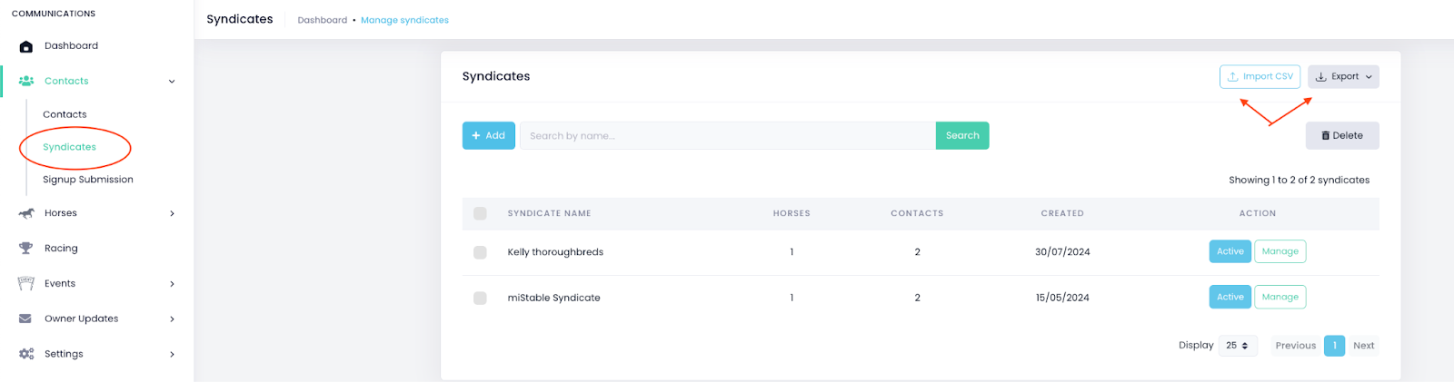 - You will now see a list of your syndicates. This includes details like the number of owners, horses, and the creation date