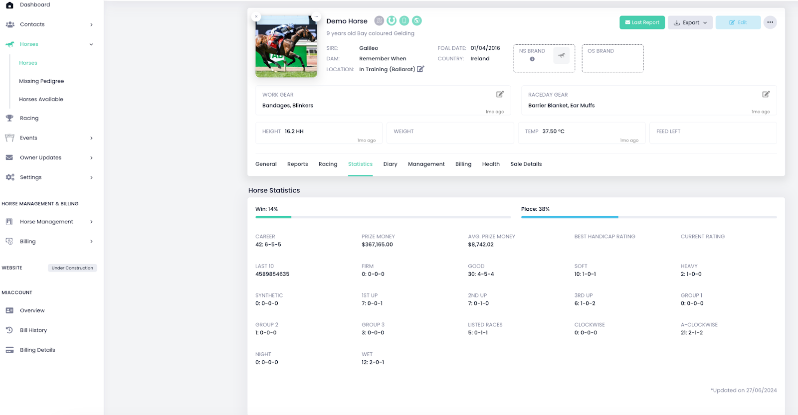- Owners, Reports, Racing Statistics, Horse Location (Diary), Management related to the horse (e.g trackwork, procedures), Invoices, Health Records, Incentives and Sales details