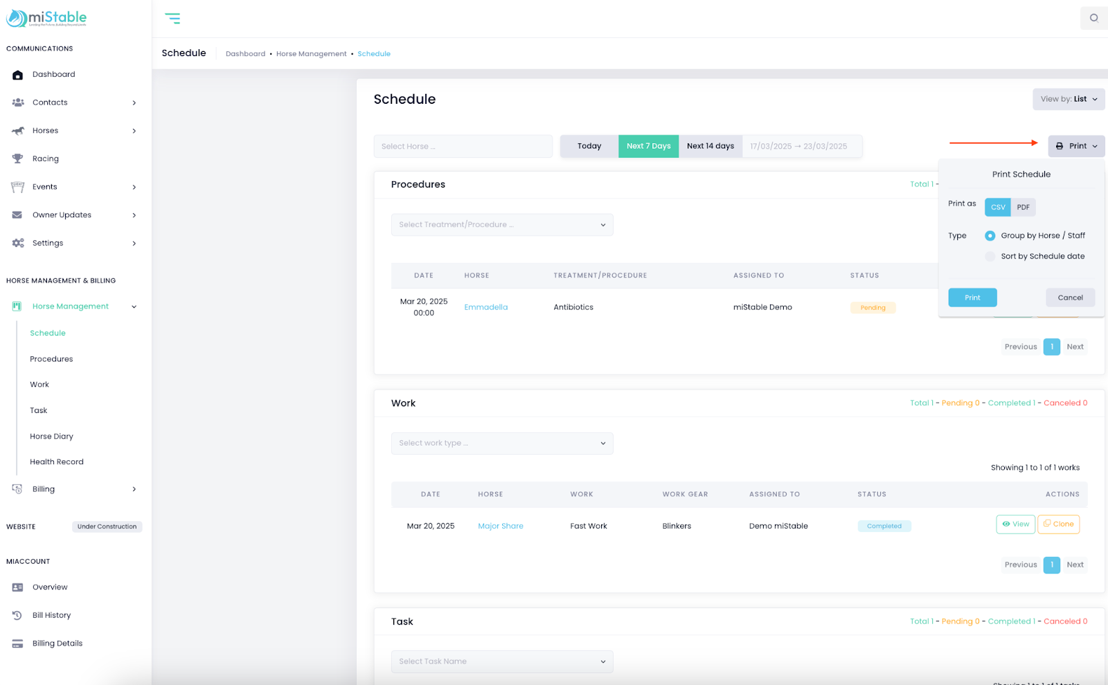 - Select whether you want to print by schedule date, by horse, or by staff member