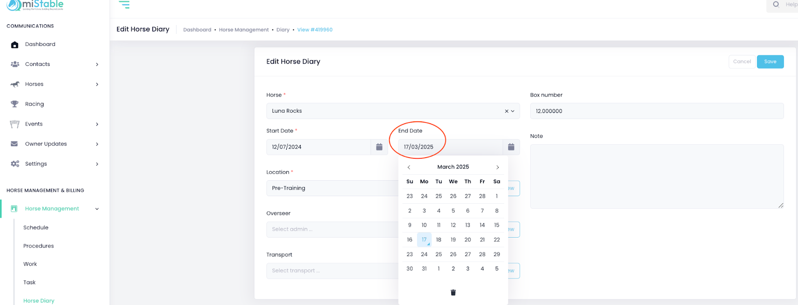 Note: If a horse is exiting the stable, or no change of location is required, use the End Date to the current location. To do this: