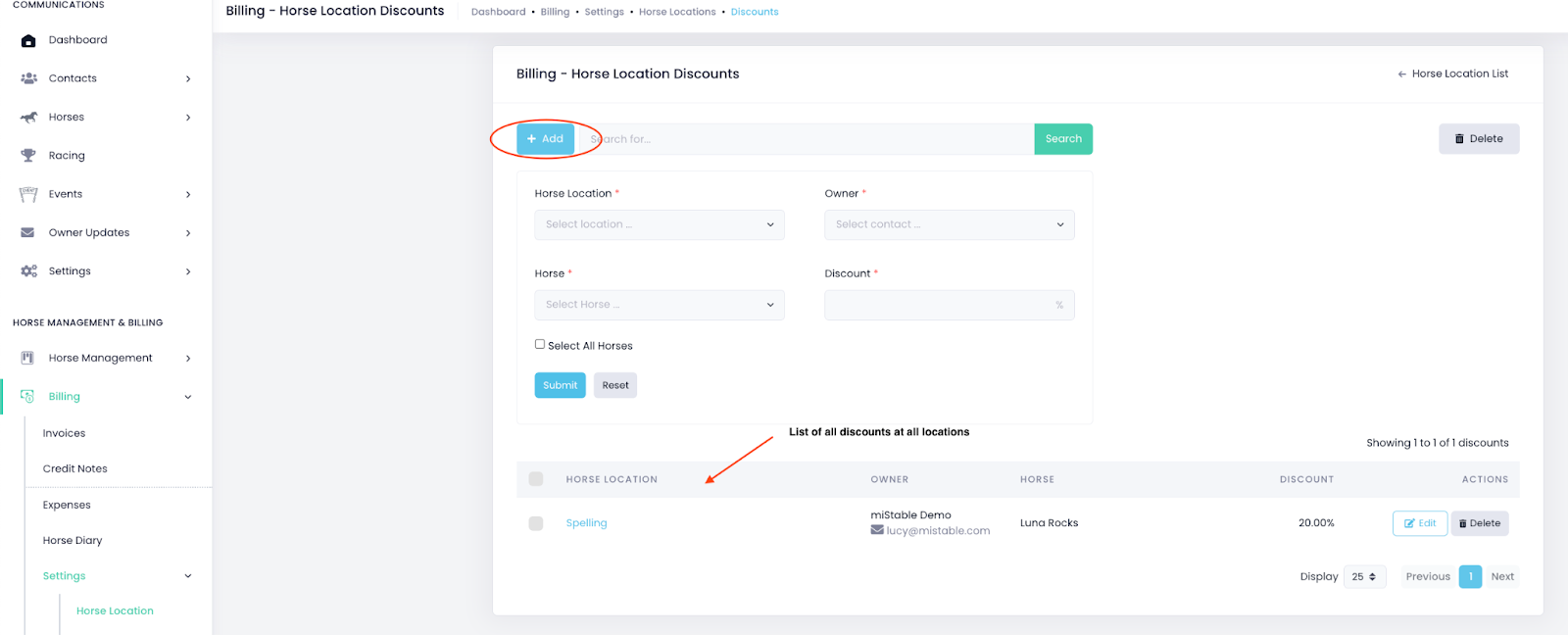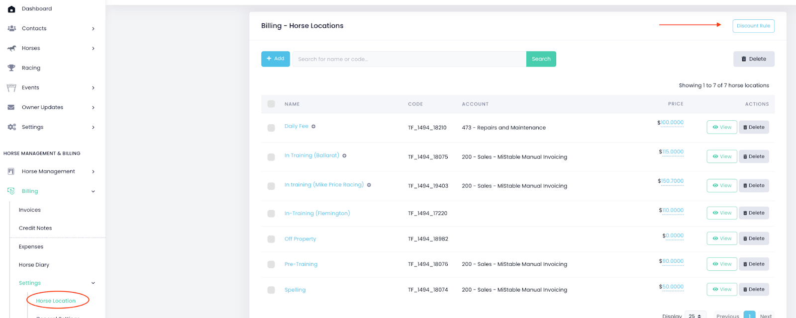 - In the discount tab, view all your discounts applied at locations depending on horse or owner