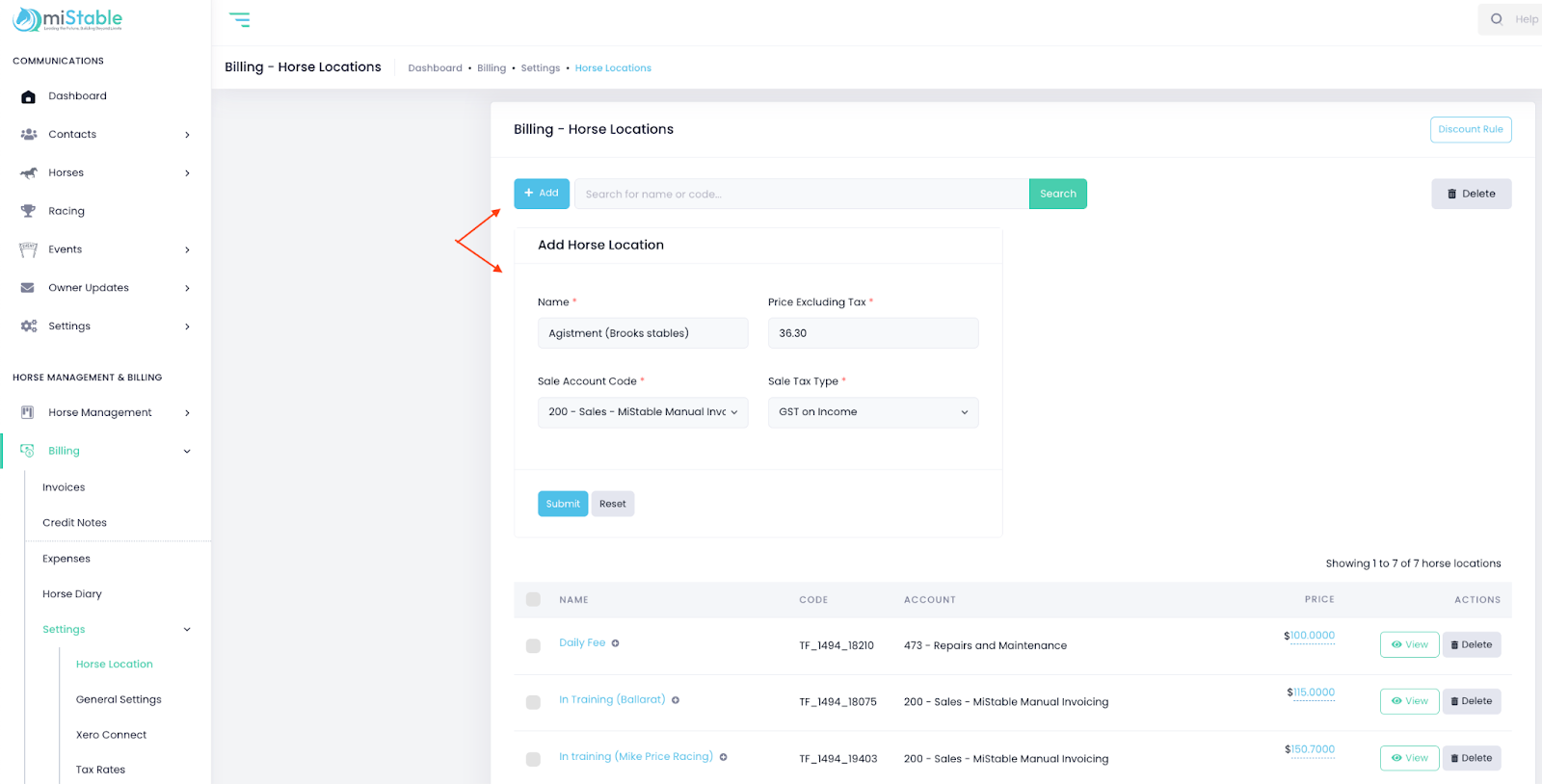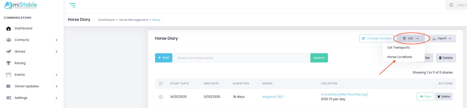 - Click the List dropdown and choose Horse Locations