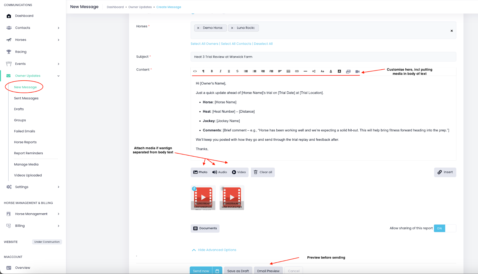 - Images, videos, audio, links, and documents by either choosing from the toolbar at the top or attaching them under the message body