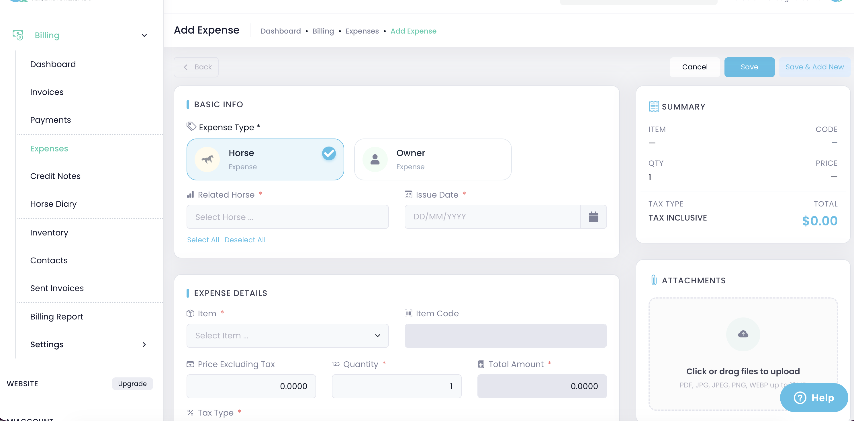 To add a new expenses → Go to Billing → Expenses → Add Expense and Enter Expense Details: