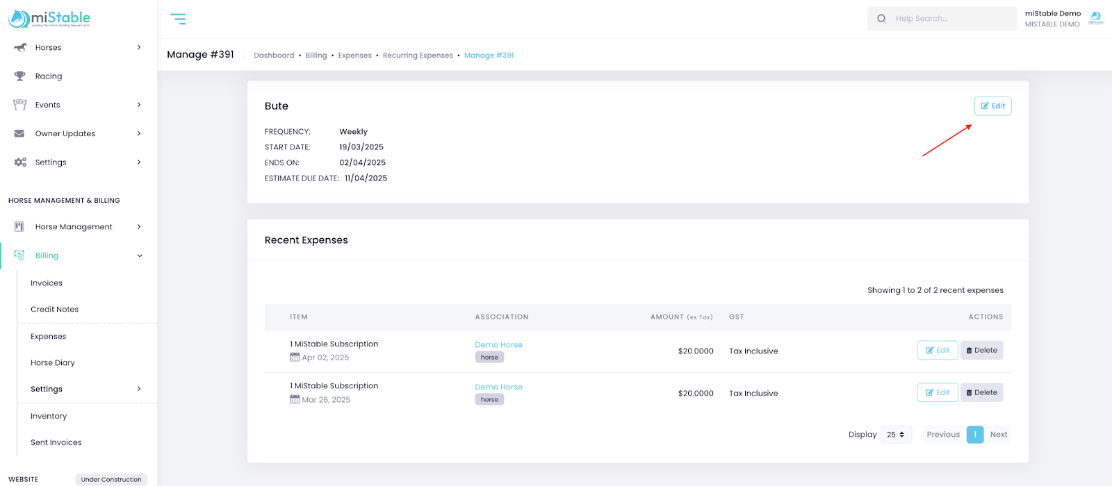 - Make any necessary changes, such as updating the expense name, frequency, or associated horse/owner.