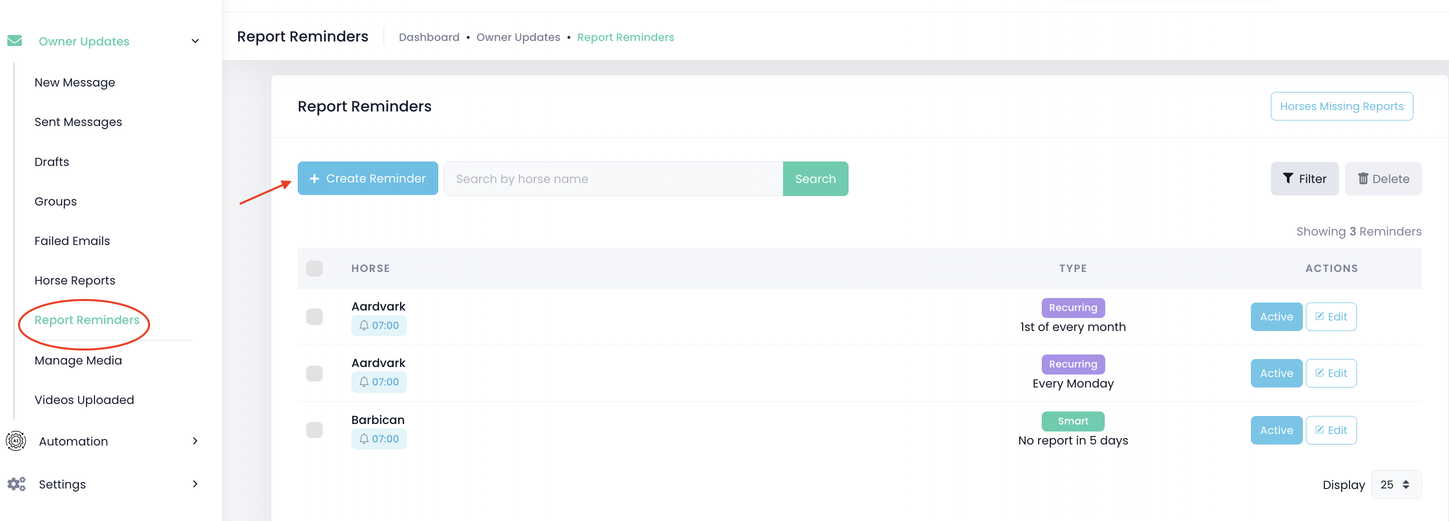 Horse Report Reminders are designed to help remind trainers to send reports. There are three types of reminders: