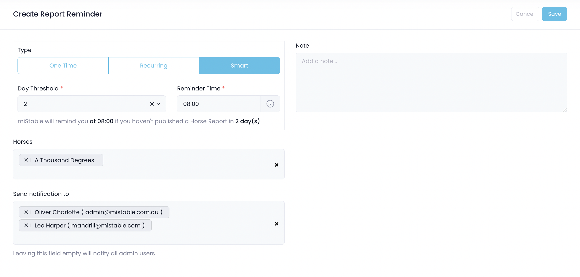 - You can select multiple horses or even choose All Horses, and you can also send reminders to multiple admins