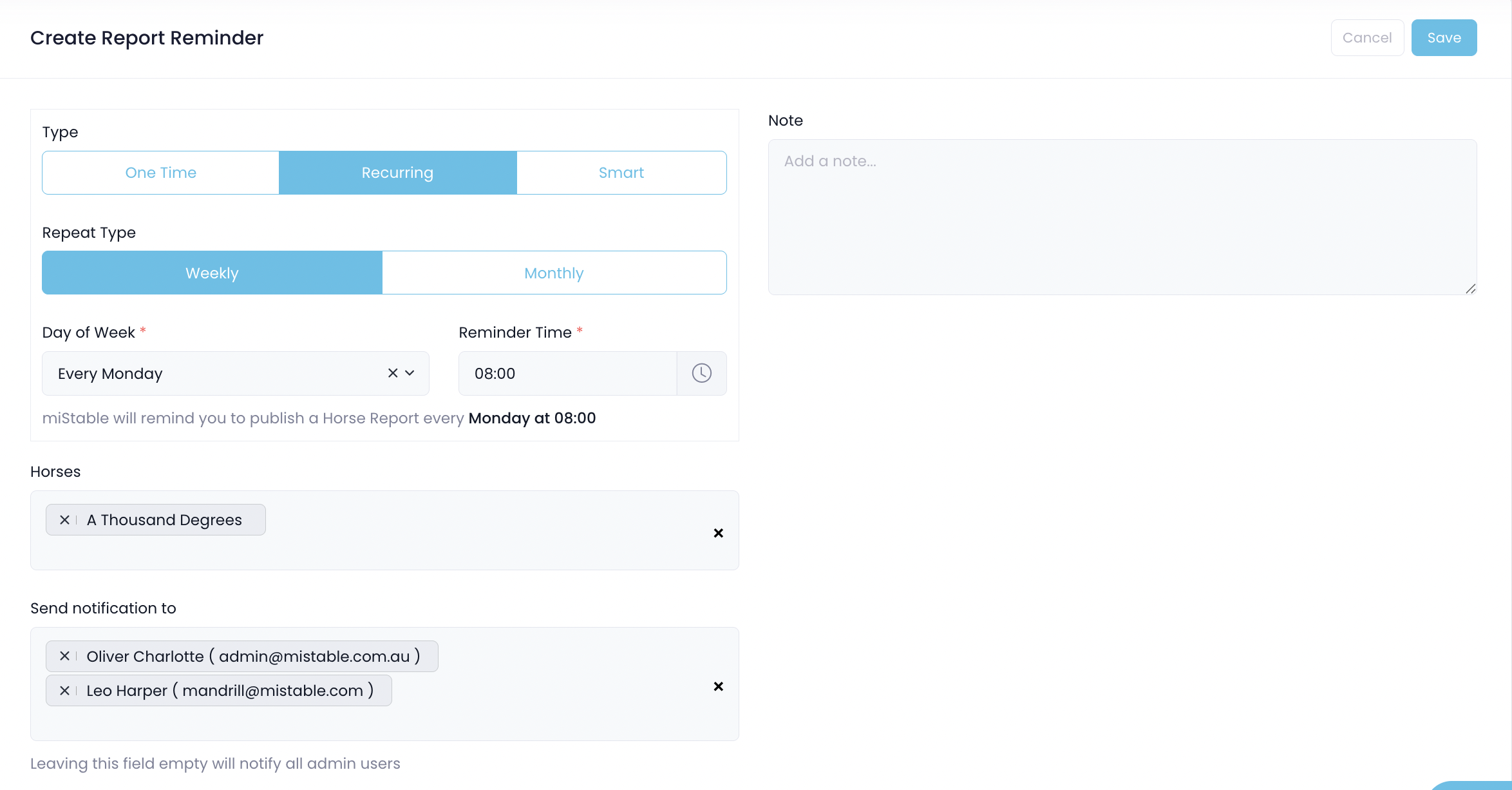 - Recurring: Reminds you to send a report for a specific horse/s on a recurring weekly schedule