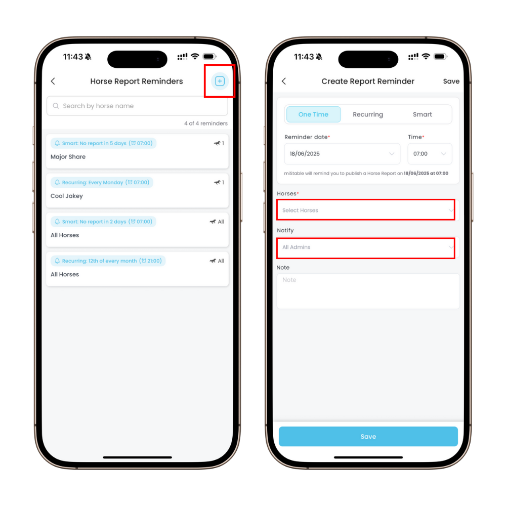 1. From the Horse Report Reminders screen, tap the plus (+) icon at the top right corner to create a new one.
