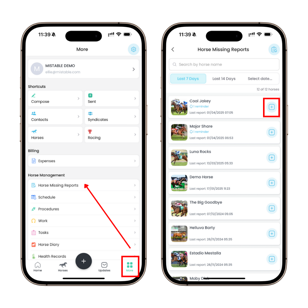 - Tap the More icon at the bottom of the screen → select Horse Missing Report