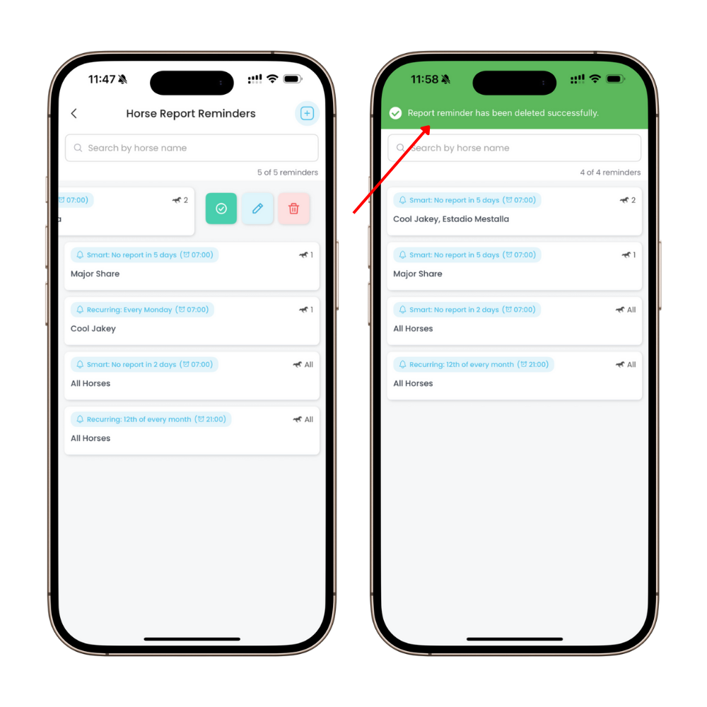 - From the Horse Report Reminders screen, swipe left on any reminder you want to update.