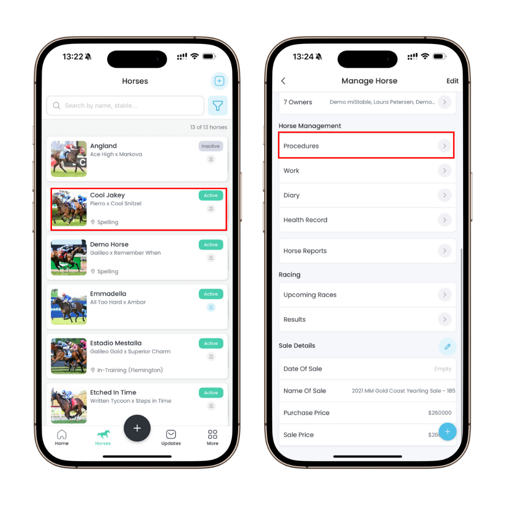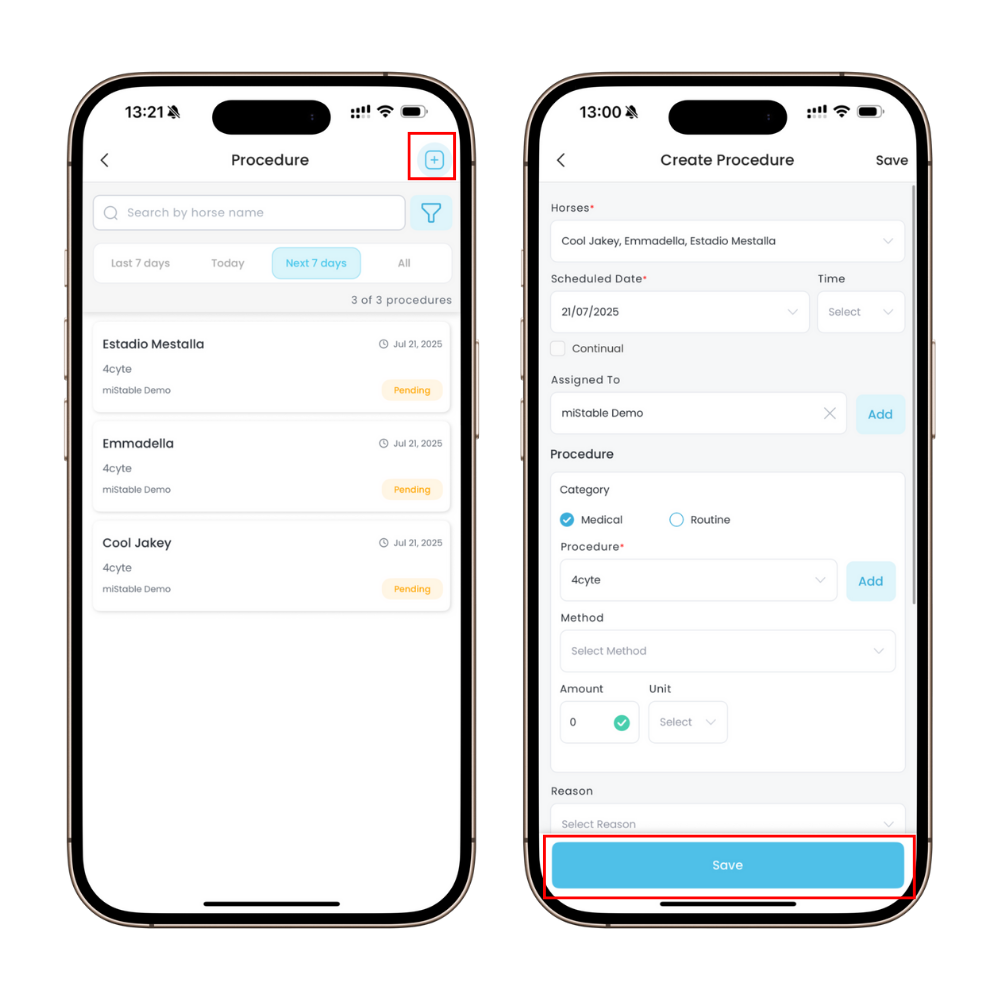 You can also Create Procedure for each individual horse by going into the horse’s profile, as shown in the example below.