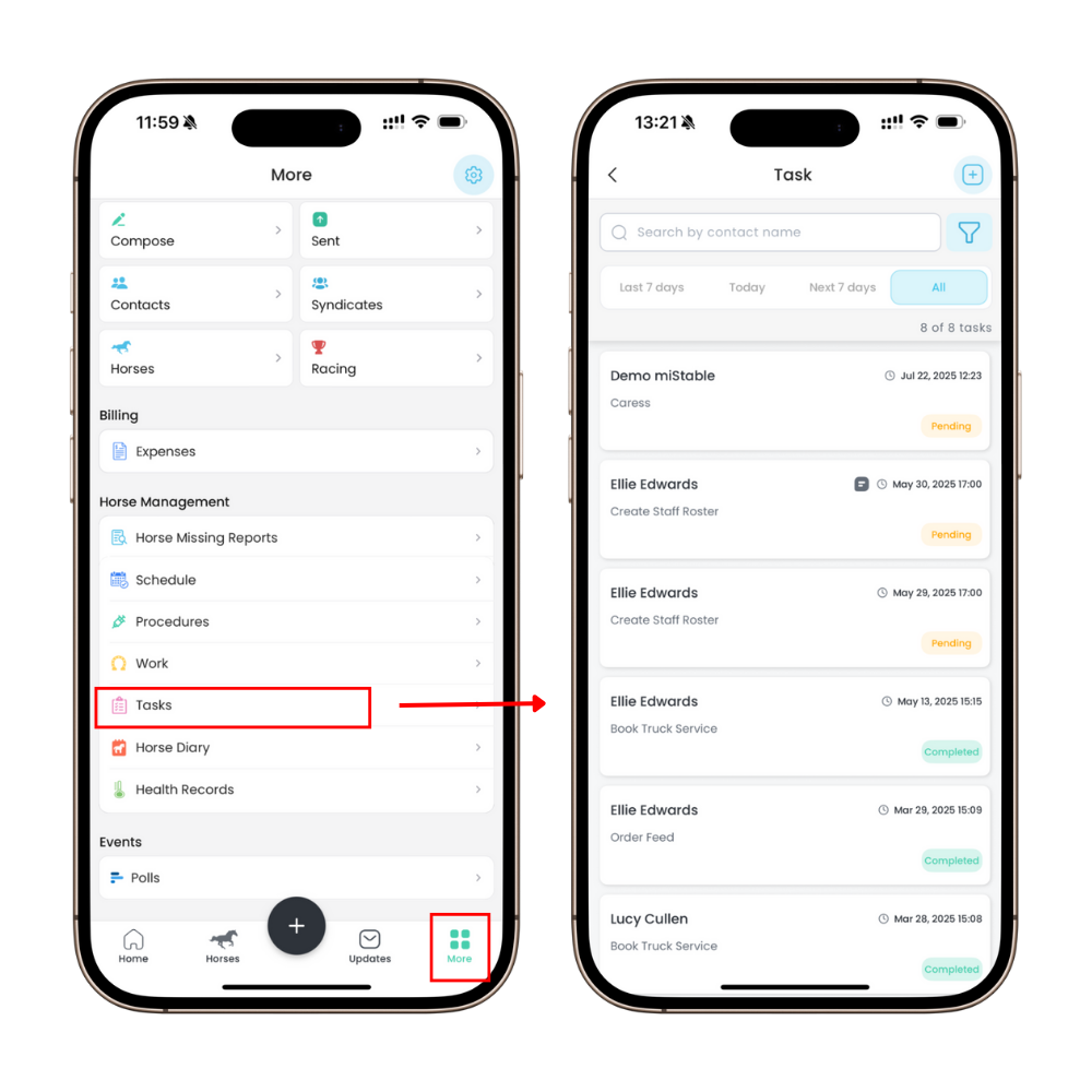 - Tap on More at the bottom of the screen and select Tasks. You’ll see the list of existing tasks here.