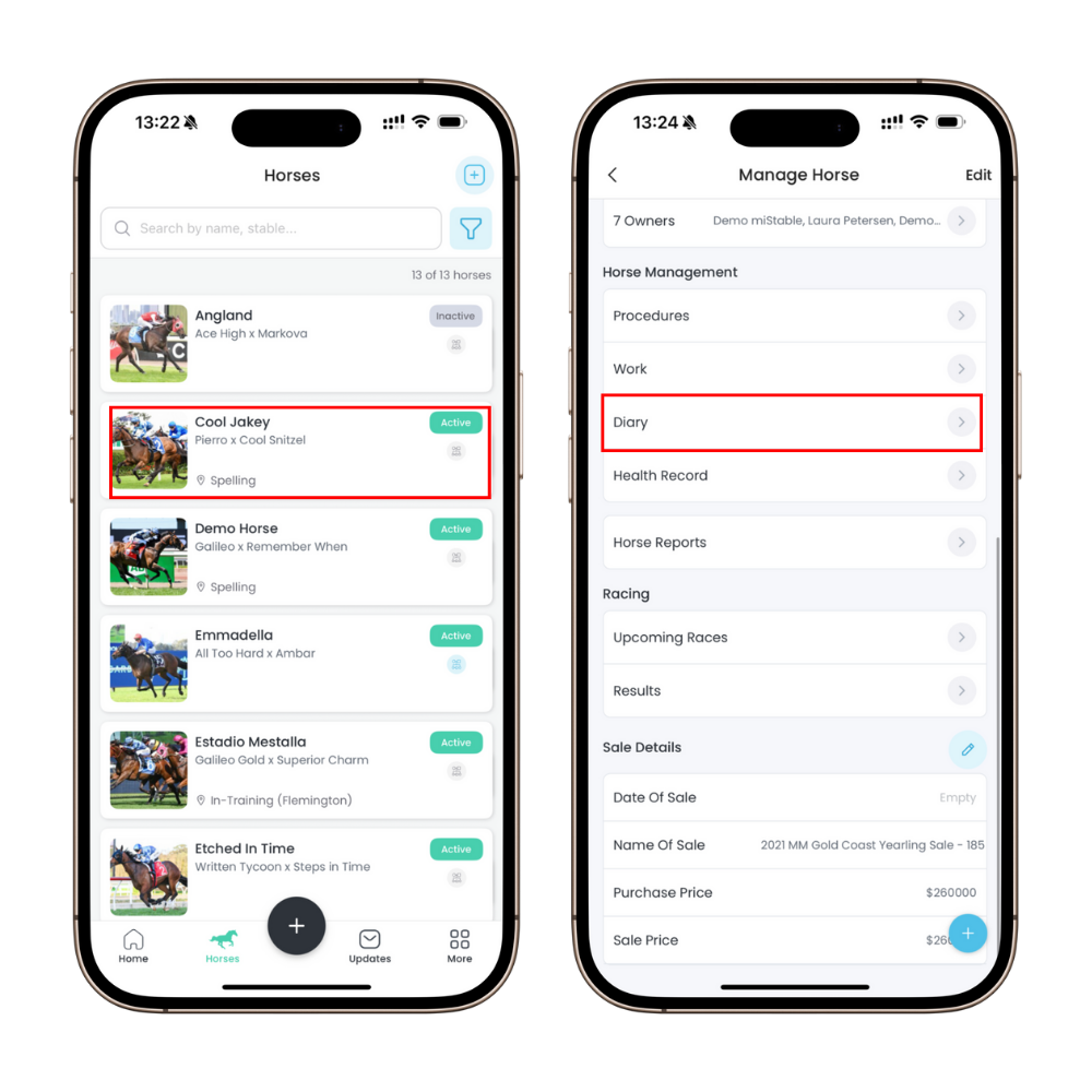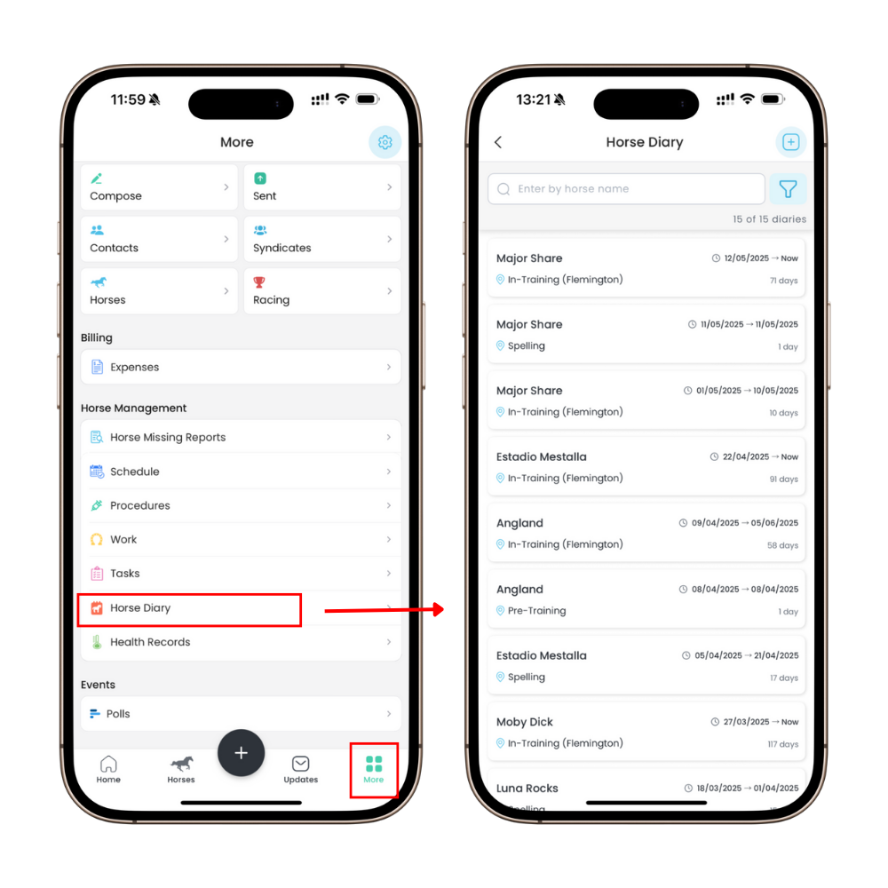 - Tap on More at the bottom of the screen and select Horse Diary. You’ll see the list of existing procedures here.