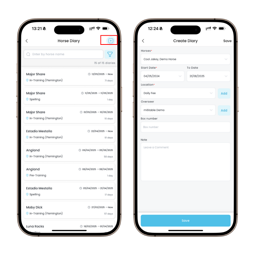 You can also Create Horse Diary for each individual horse by going into the horse’s profile, as shown in the example below.