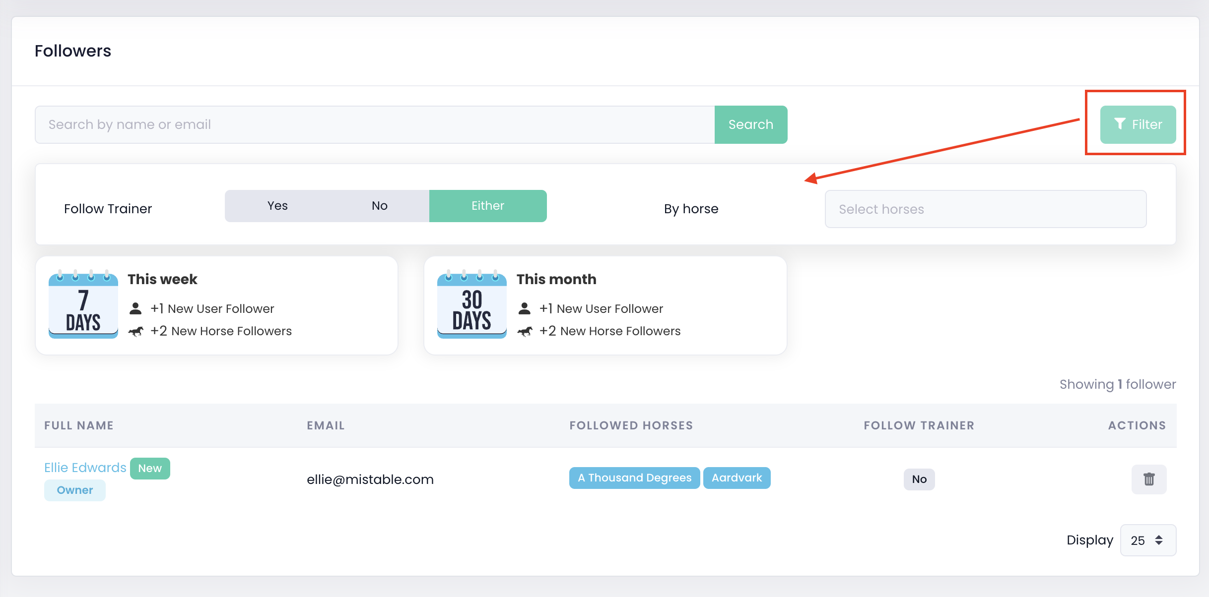 You can filter your followers list by various conditions such as Follow Trainer or Horse Name.