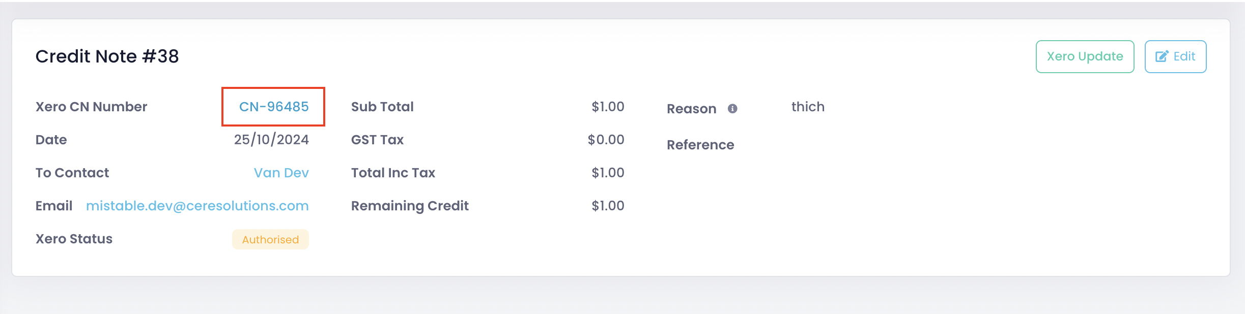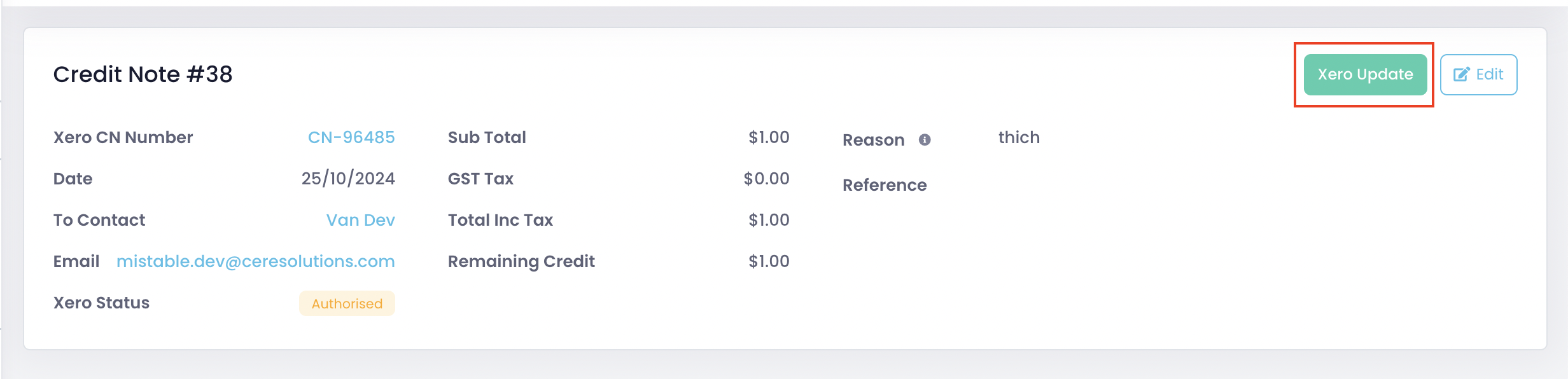 4. Go back to the credit note details page in miStable and click Xero Update.