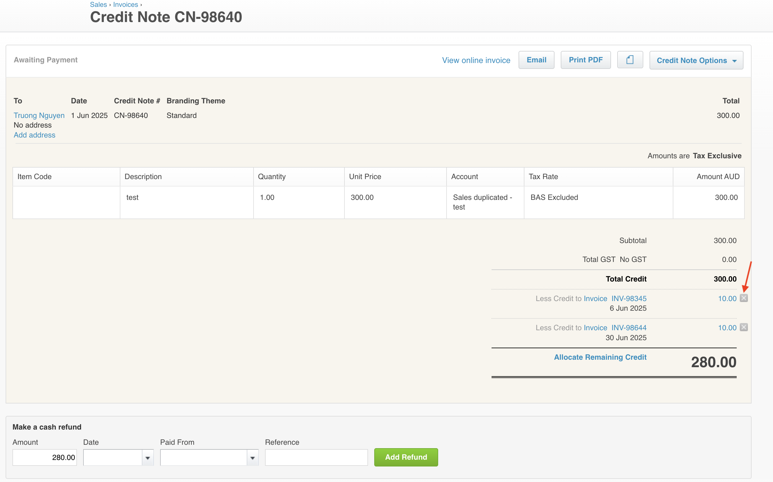 3. On the Xero Credit Note details screen, remove the allocation by clicking the X next to Less Credit to Invoice ….