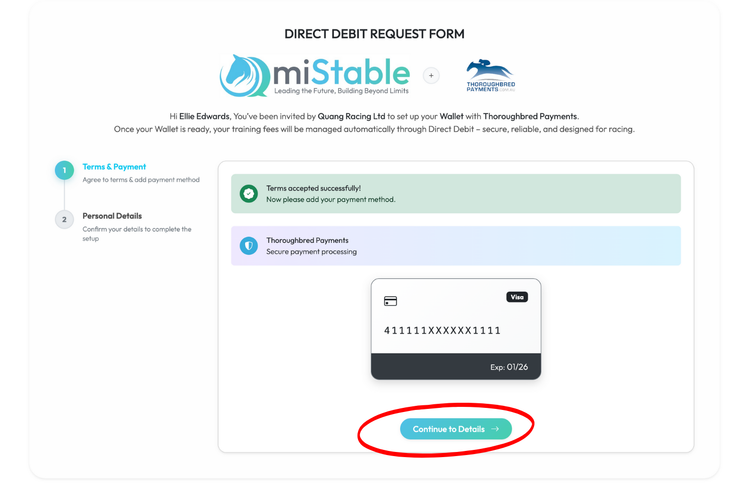 Once the Owner has clicked on the Direct Debit link in the email, the Owner will see a Direct Debit Request Form as per the example below. The Owner will need to agree to the T&C’s then proceed by clicking the Accept & Continue.