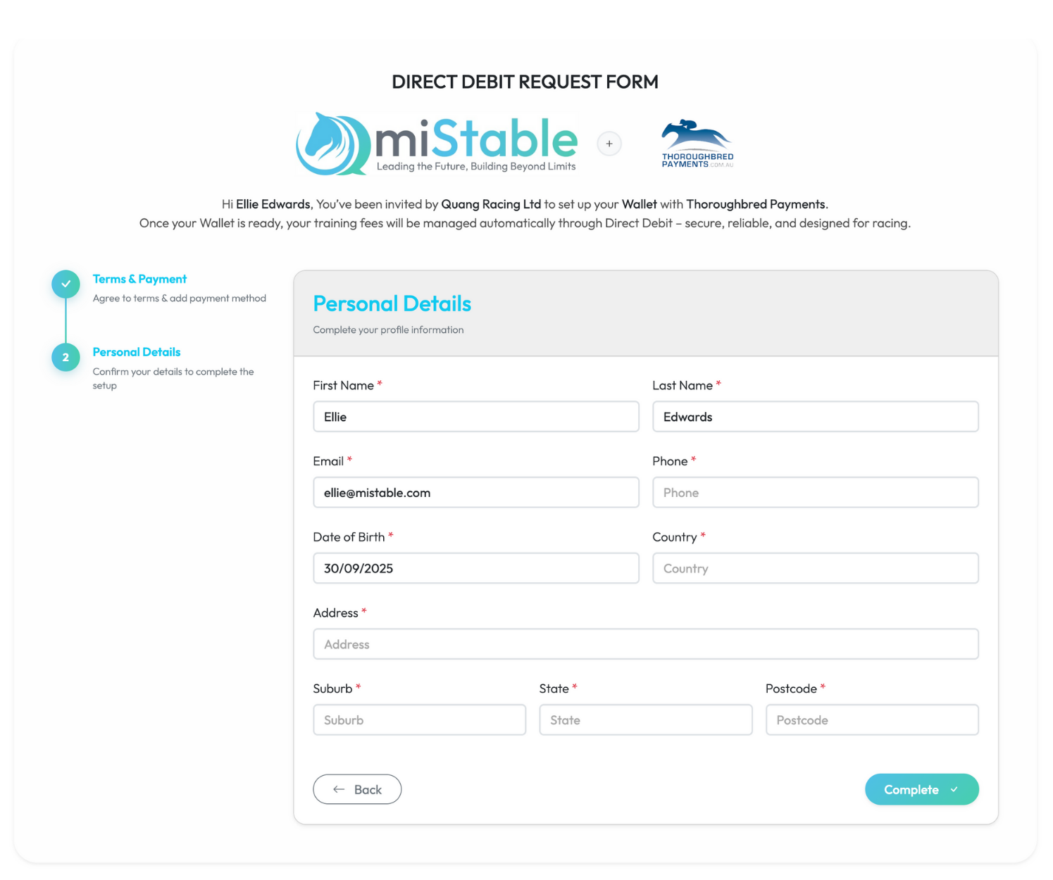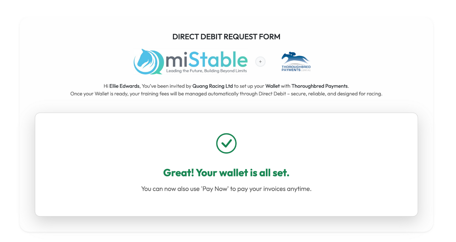 Both the customer and the merchant will receive an email to advise that their direct debit registration was successfully completed.